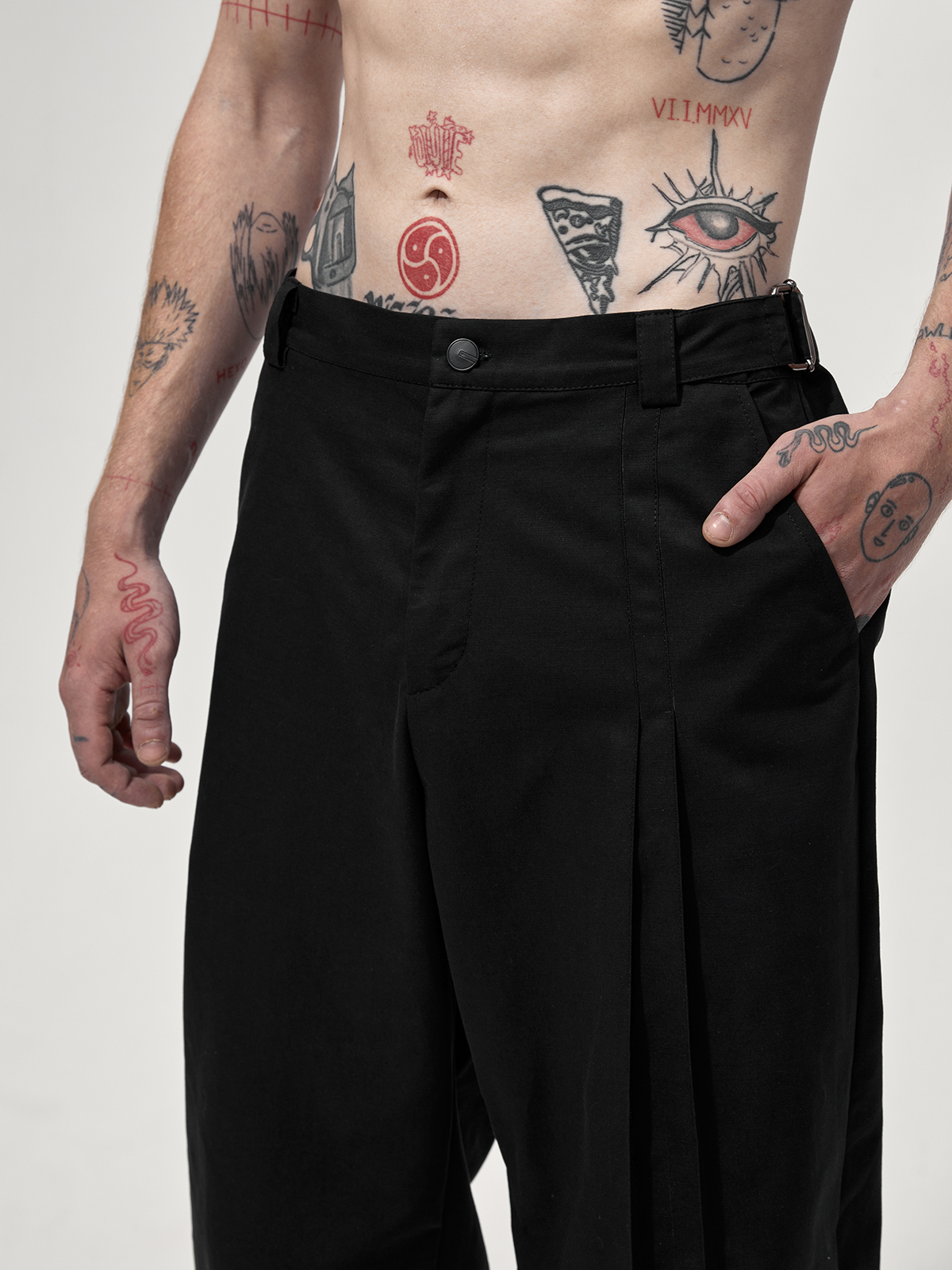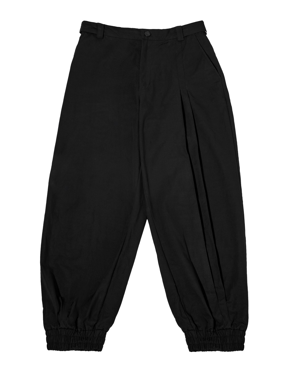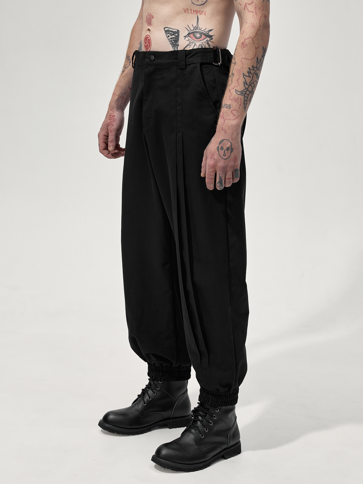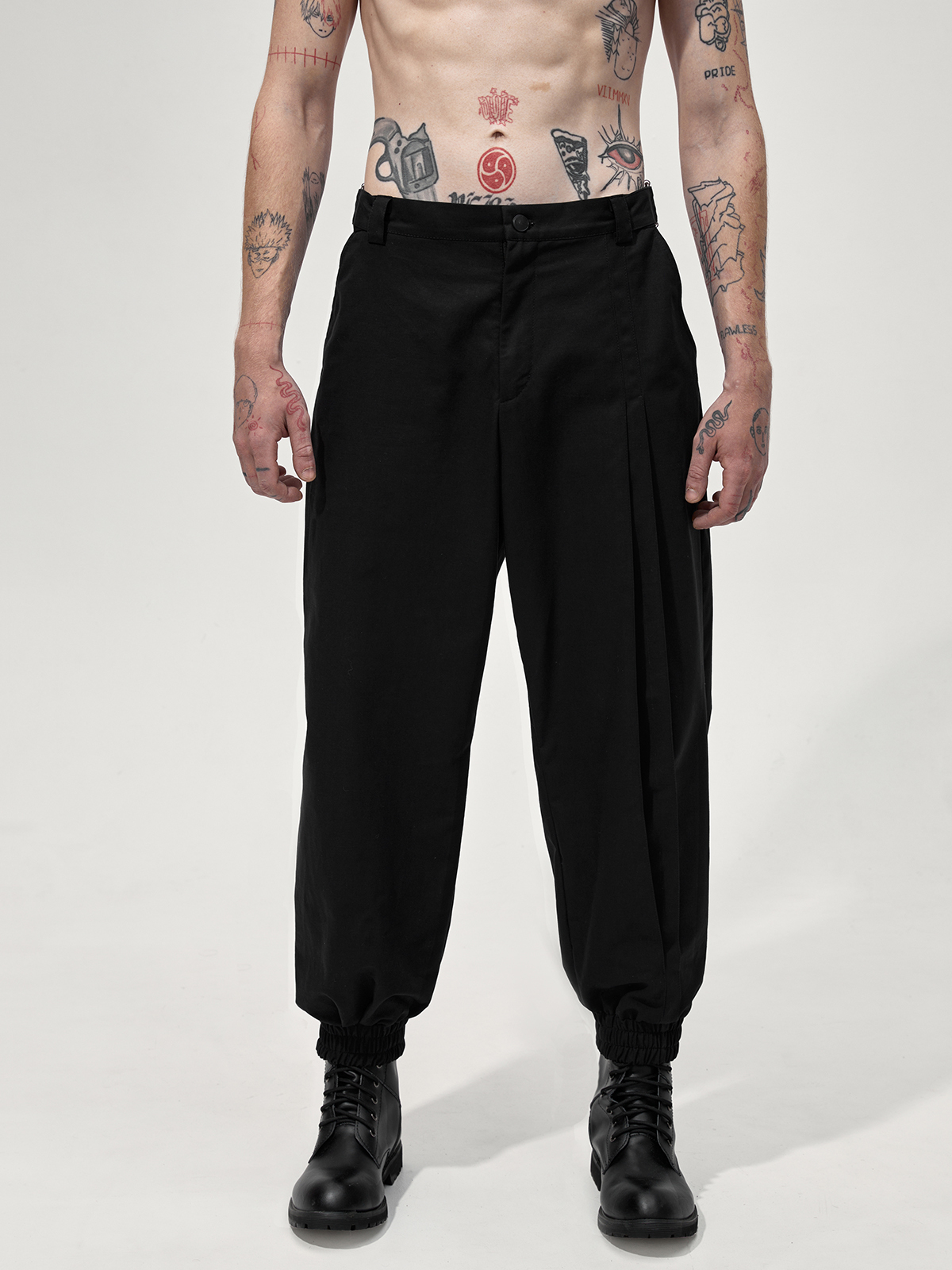 Просторные брюки из 100% хлопка с peach-эффектом. С левой стороны застрочены две вертикальные складки. Боковые карманы. Пояс со шлёвками под ремень и регулировками размера по бокам. Застёжка на металлическую молнию и пуговицу. Свободная манжета по низу изделия позволяет сохранить силуэт и при этом не стесняет движений.