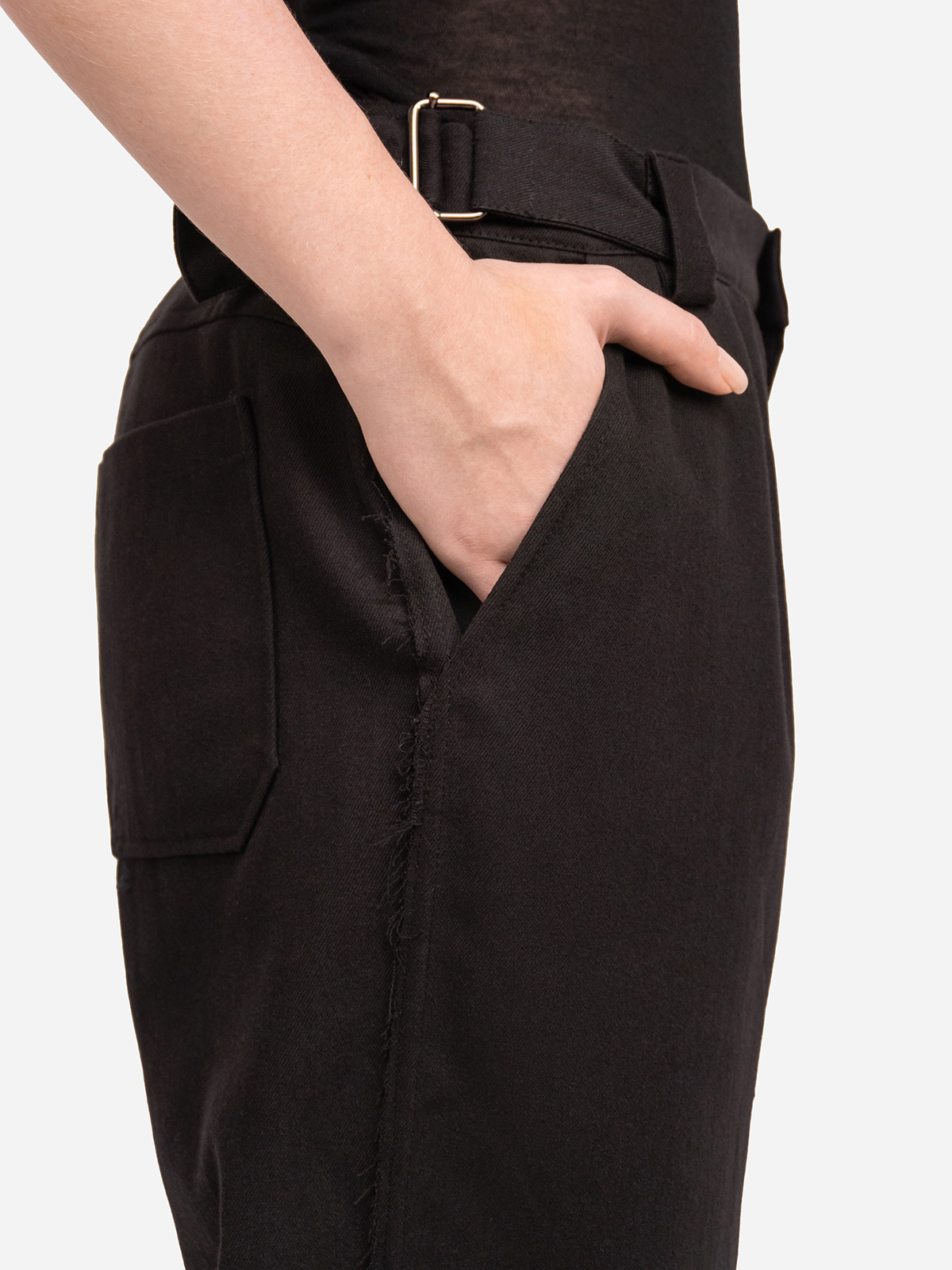 Брюки унисекс из смесового денима с открытыми срезами. Силуэт умеренной ширины, с защипами спереди и небольшим заужением книзу, два боковых и два задних накладных кармана, левый карман с декоративной складкой.