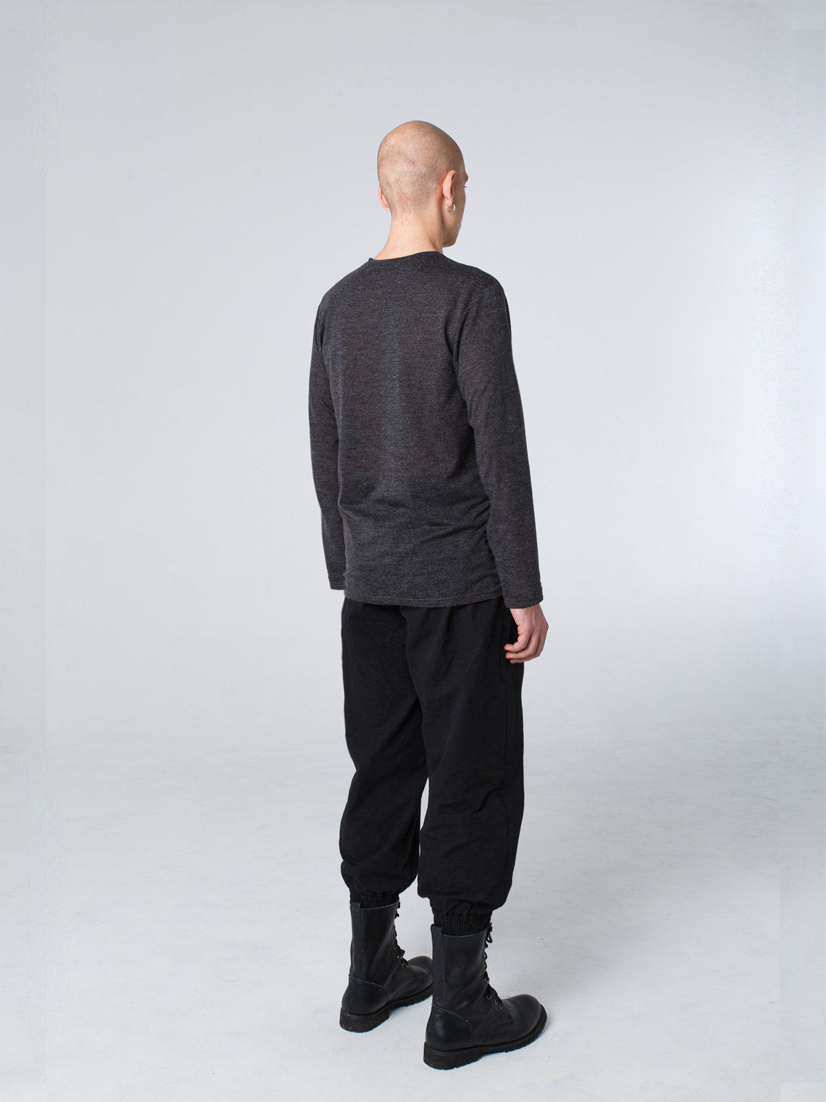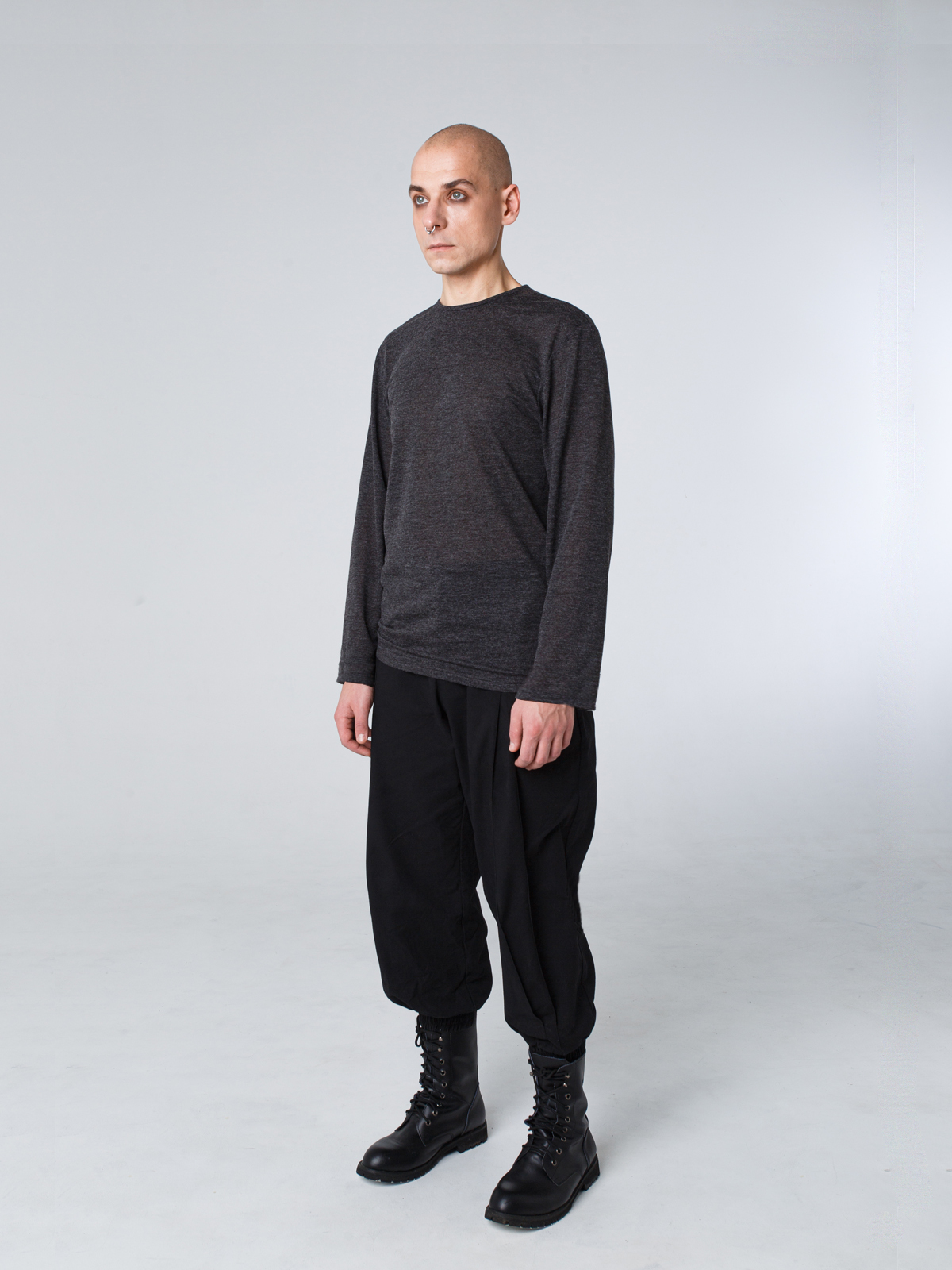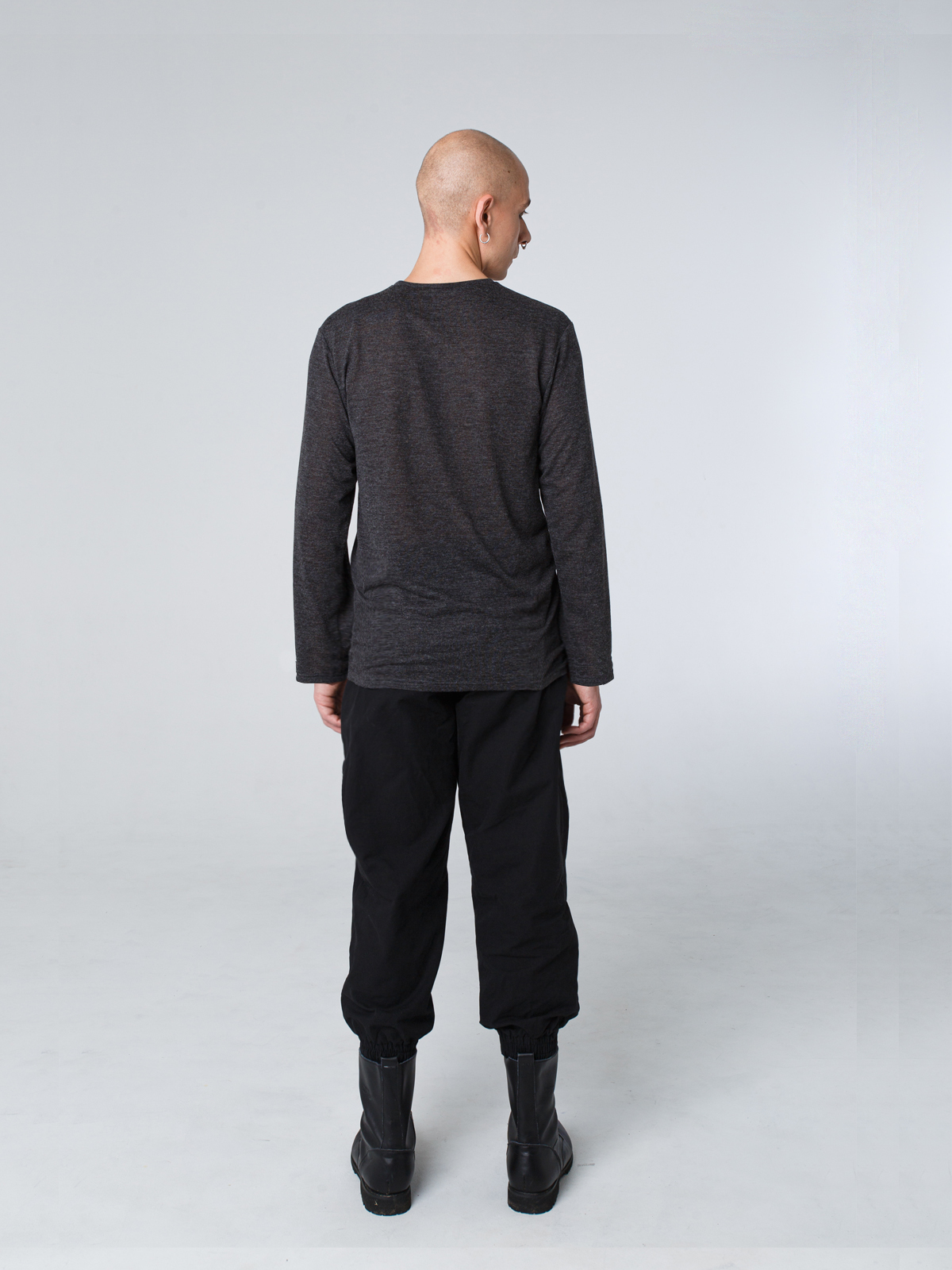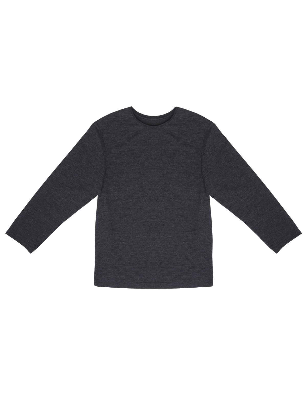 Лонгслив унисекс с круглым вырезом прямого силуэта из темно-серого меланжевого трикотажа. Полотно тонкой вязки из тенсела и вискозы приятно к телу и комфортно в любую погоду.