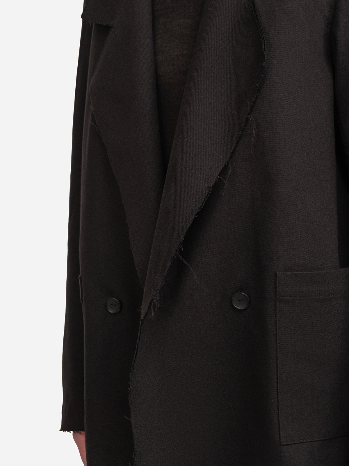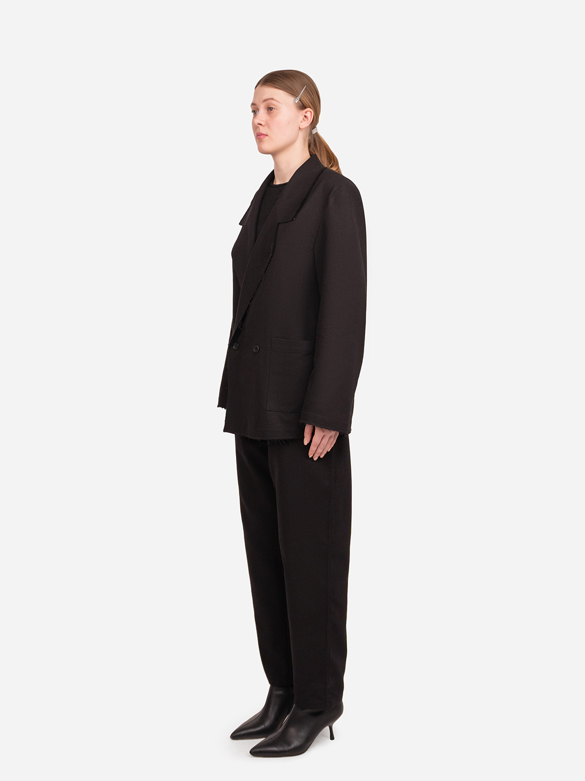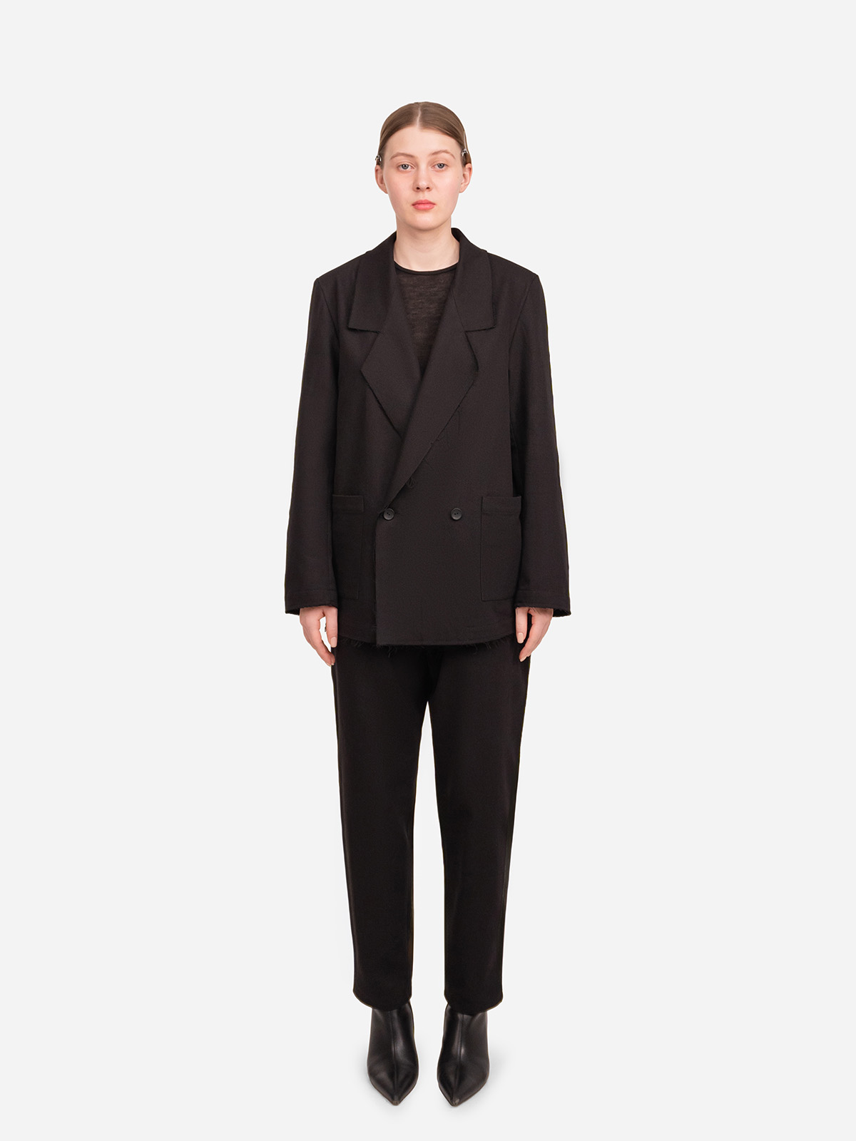 Легкий двубортный пиджак без подкладки из смесового денима с открытыми срезами. Силуэт умеренный оверсайз, два накладных кармана, может застегиваться как на женскую сторону, так и на мужскую.