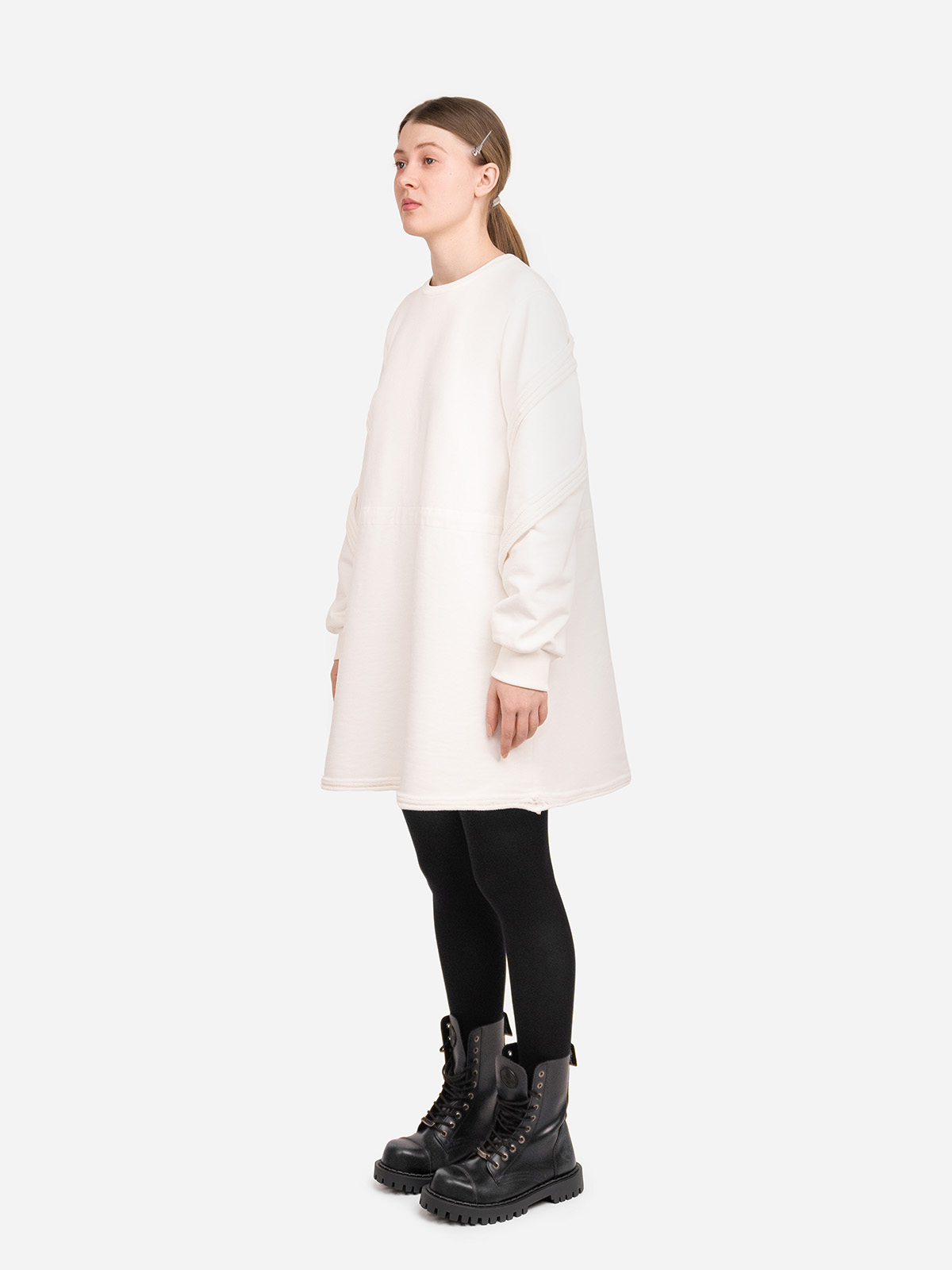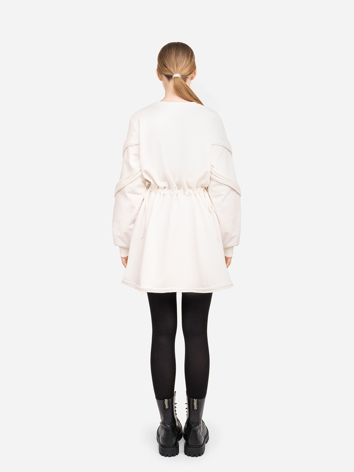 Платье длиной выше колен из плотного хлопкового футера с петельной изнанкой с утяжками на поясе и декоративными деталями на рукавах. Есть карманы в боковых швах.