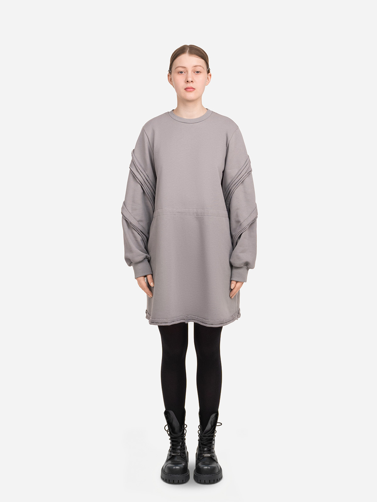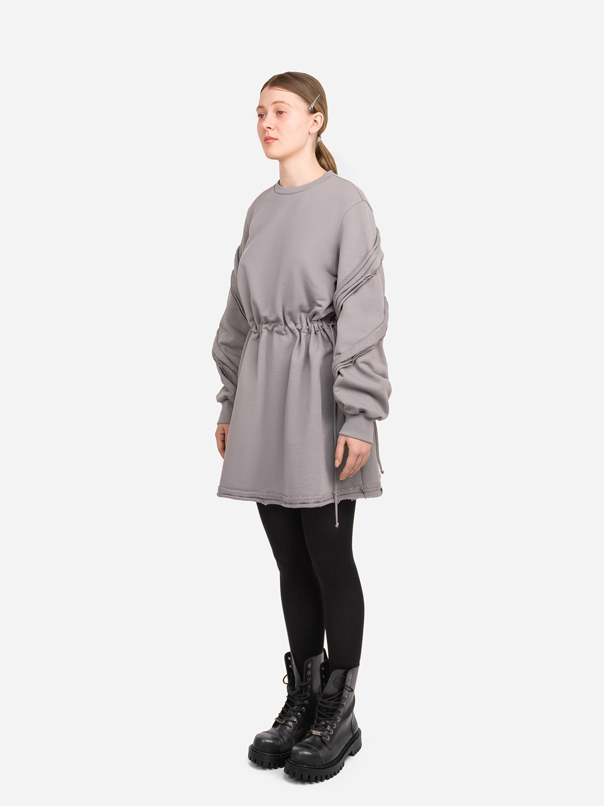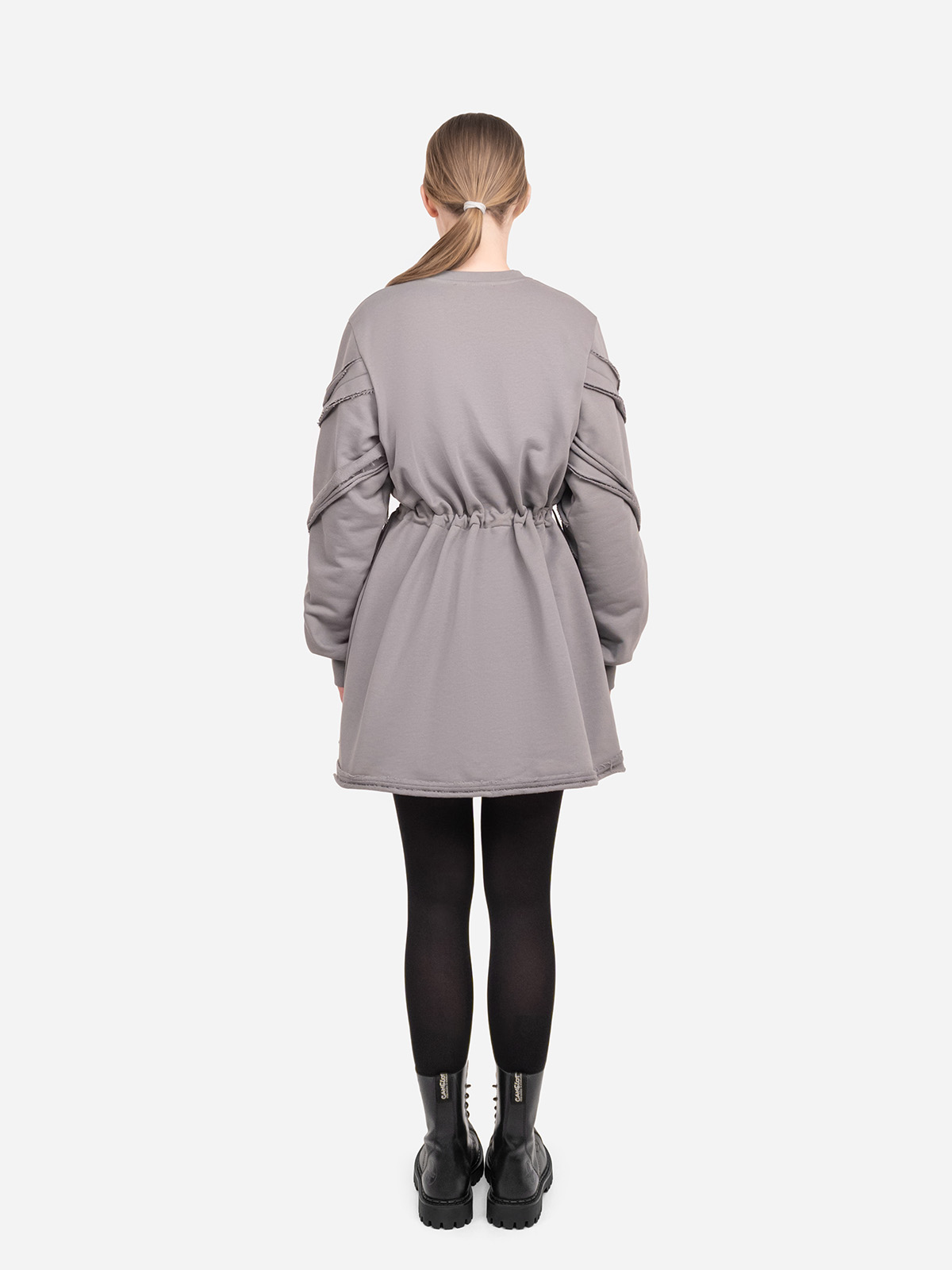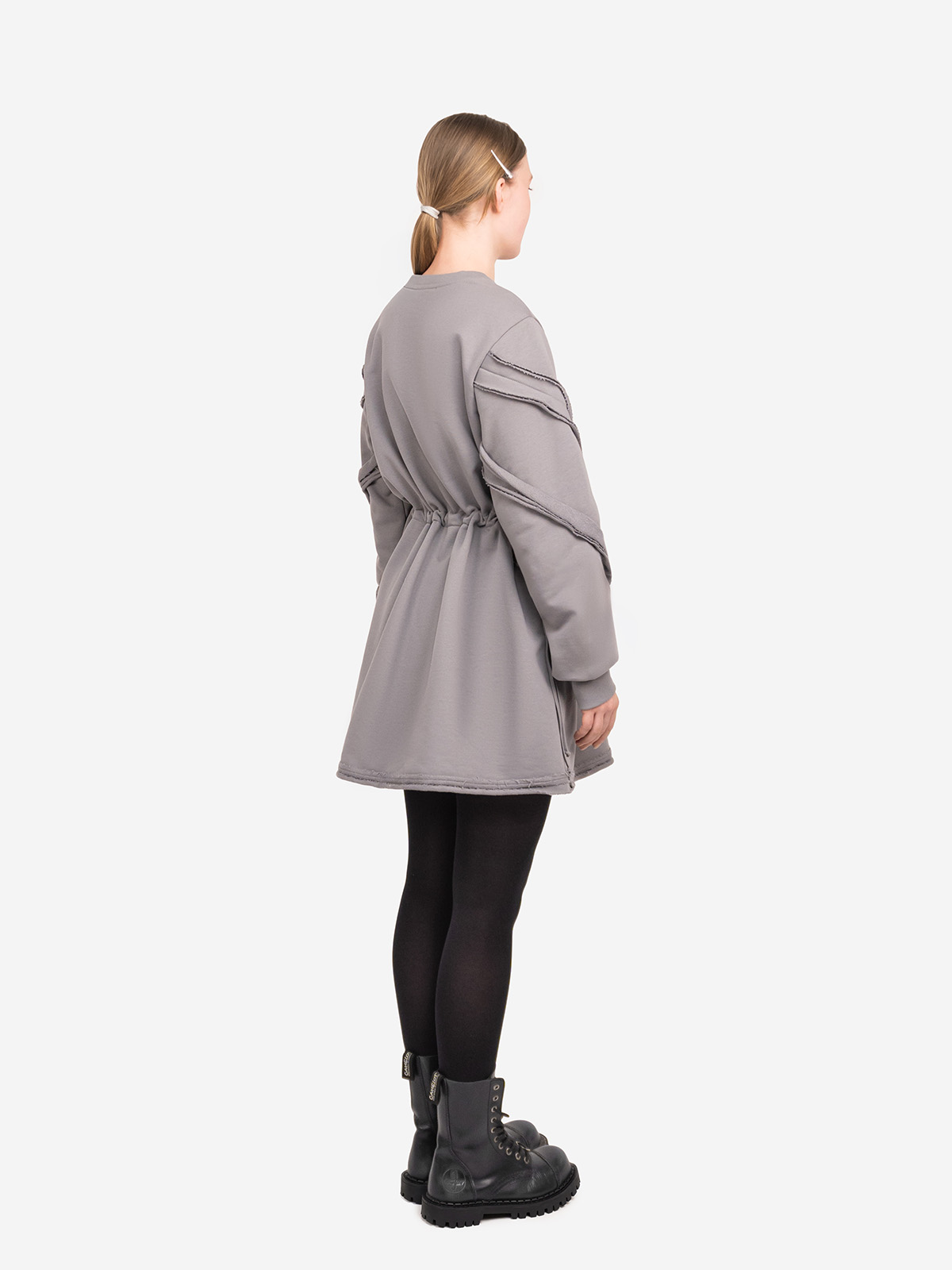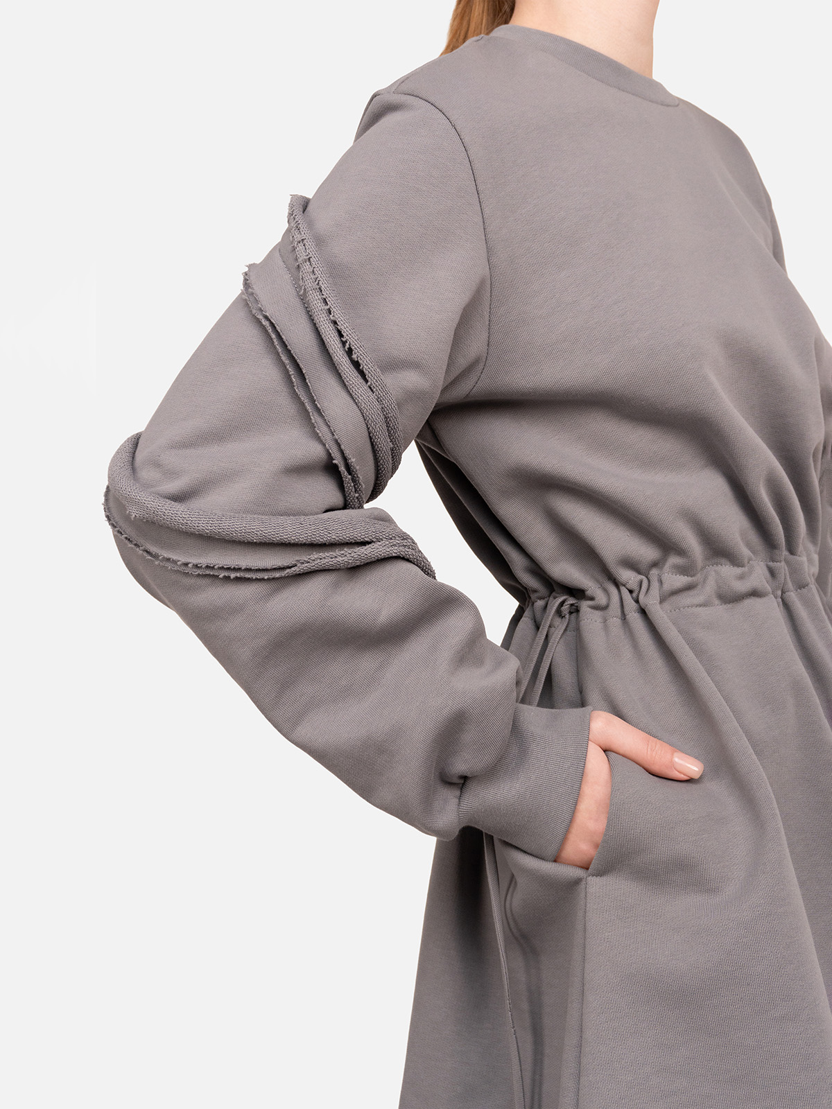 Платье длиной выше колен из плотного хлопкового футера с петельной изнанкой с утяжками на поясе и декоративными деталями на рукавах. Есть карманы в боковых швах.