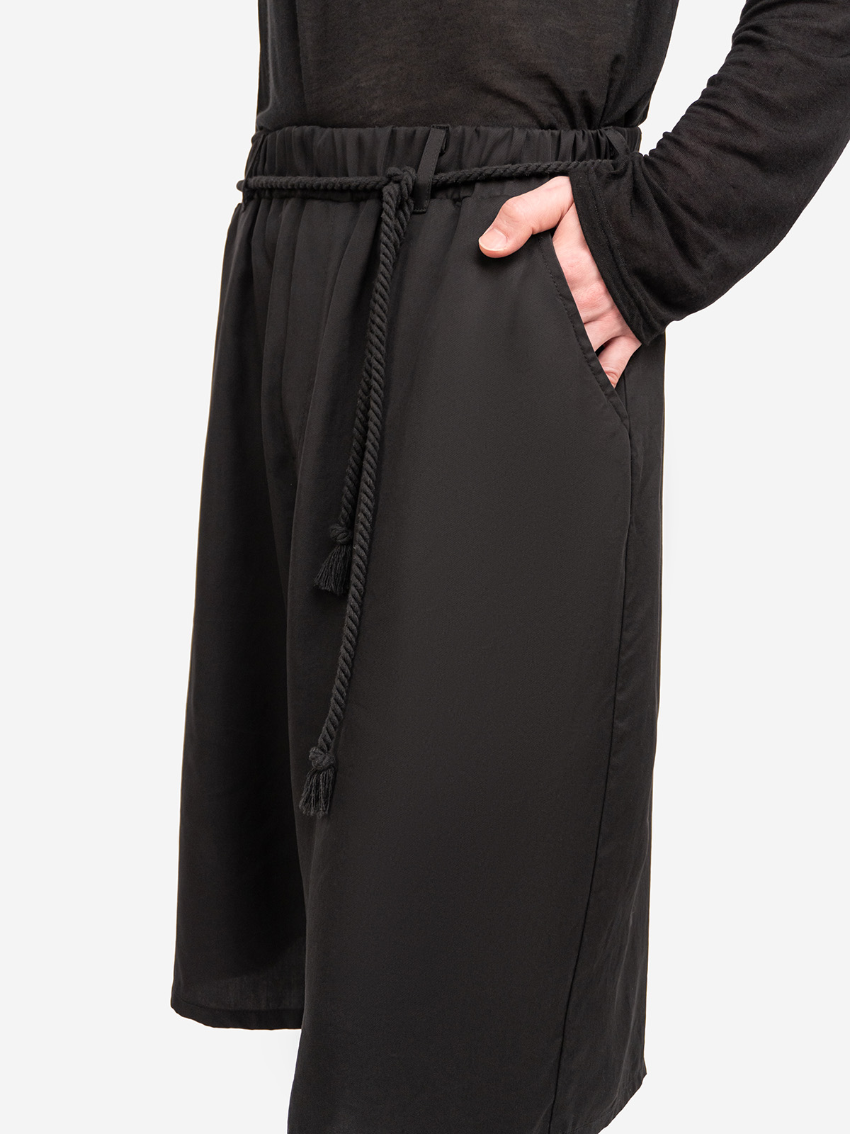 Просторные шорты длиной чуть ниже колена из струящейся, прохладной на ощупь купры. Пояс на комфортной резинке с витым шнурком на шлевках, глубокие боковые карманы.