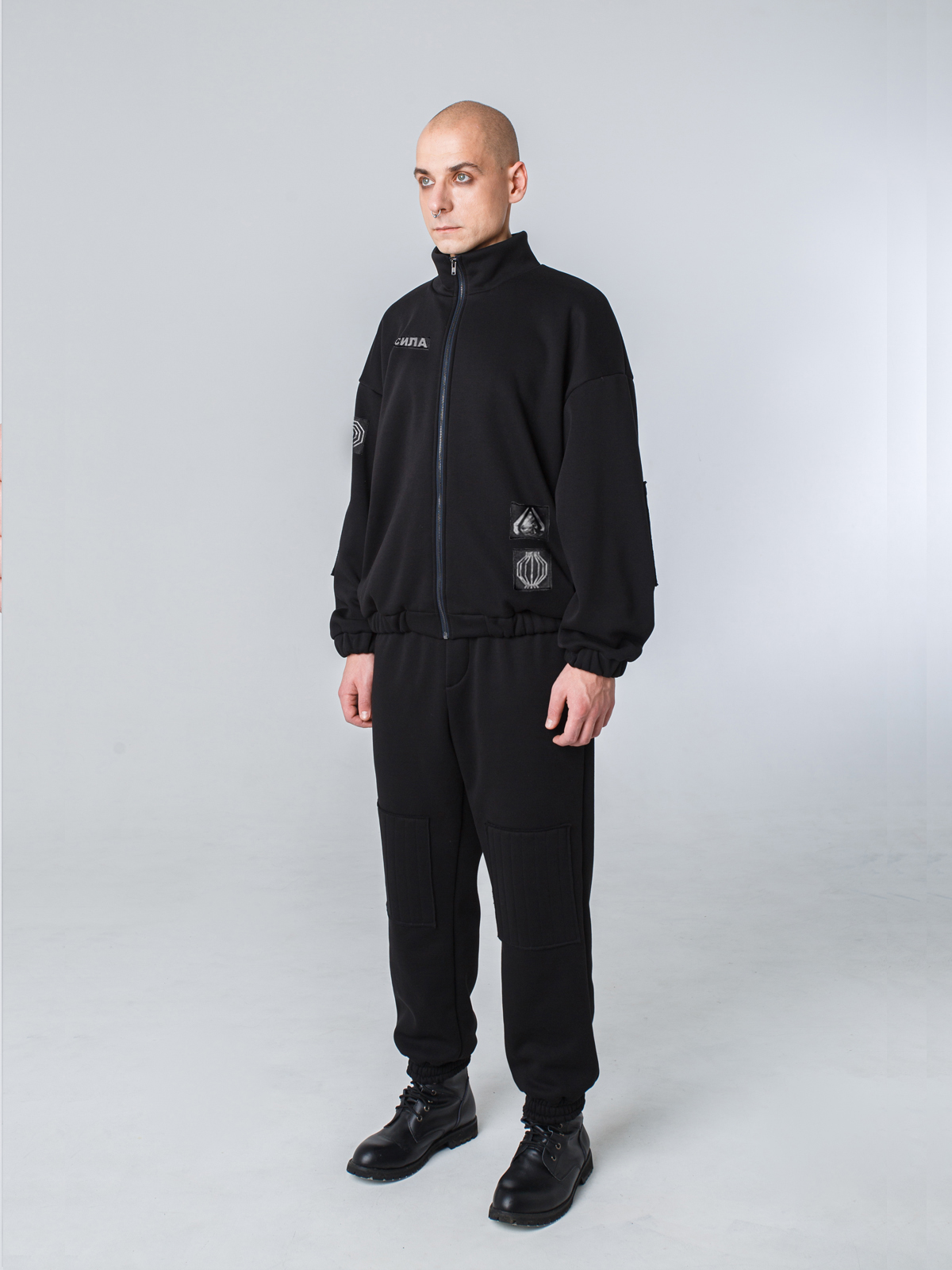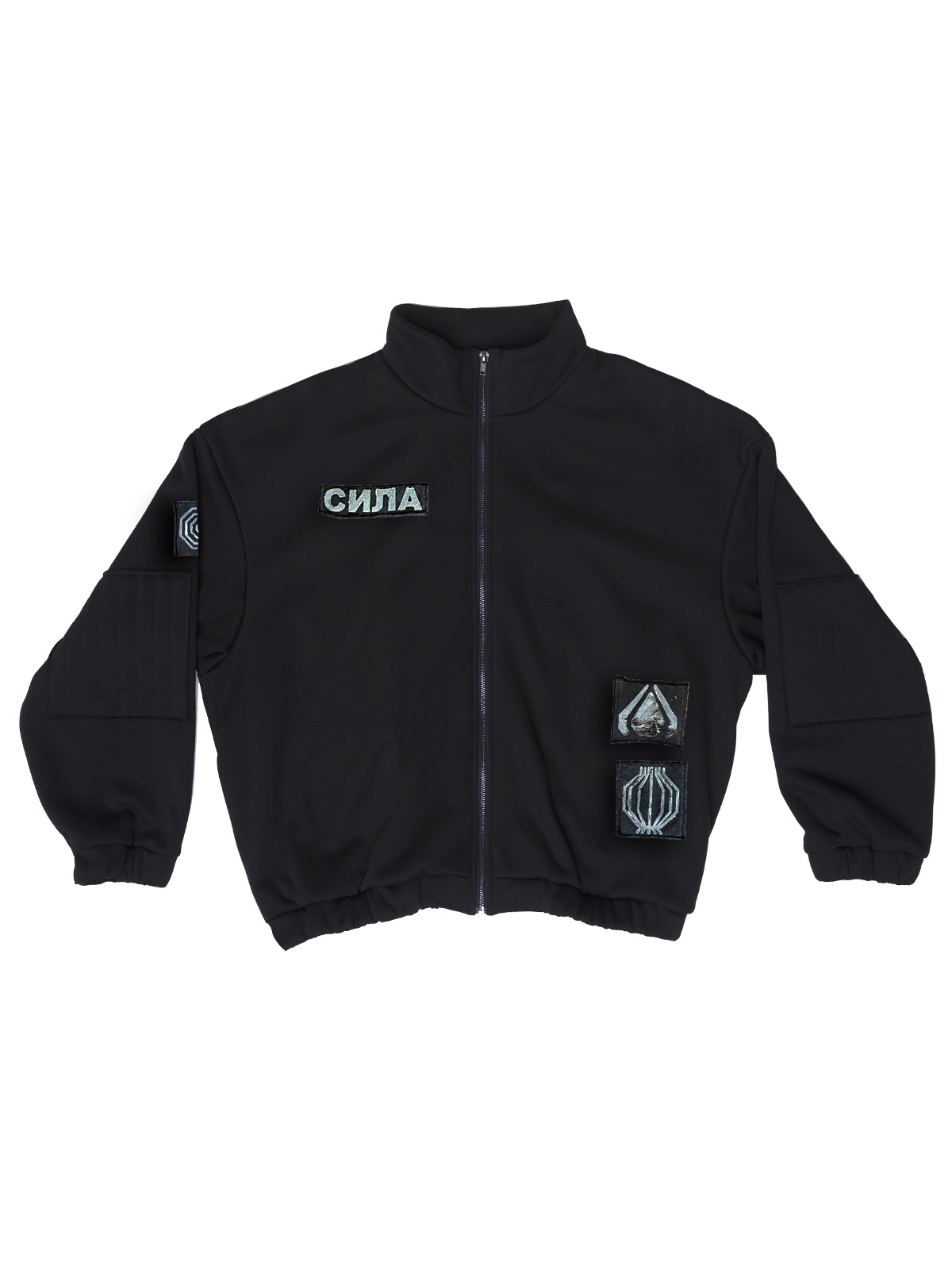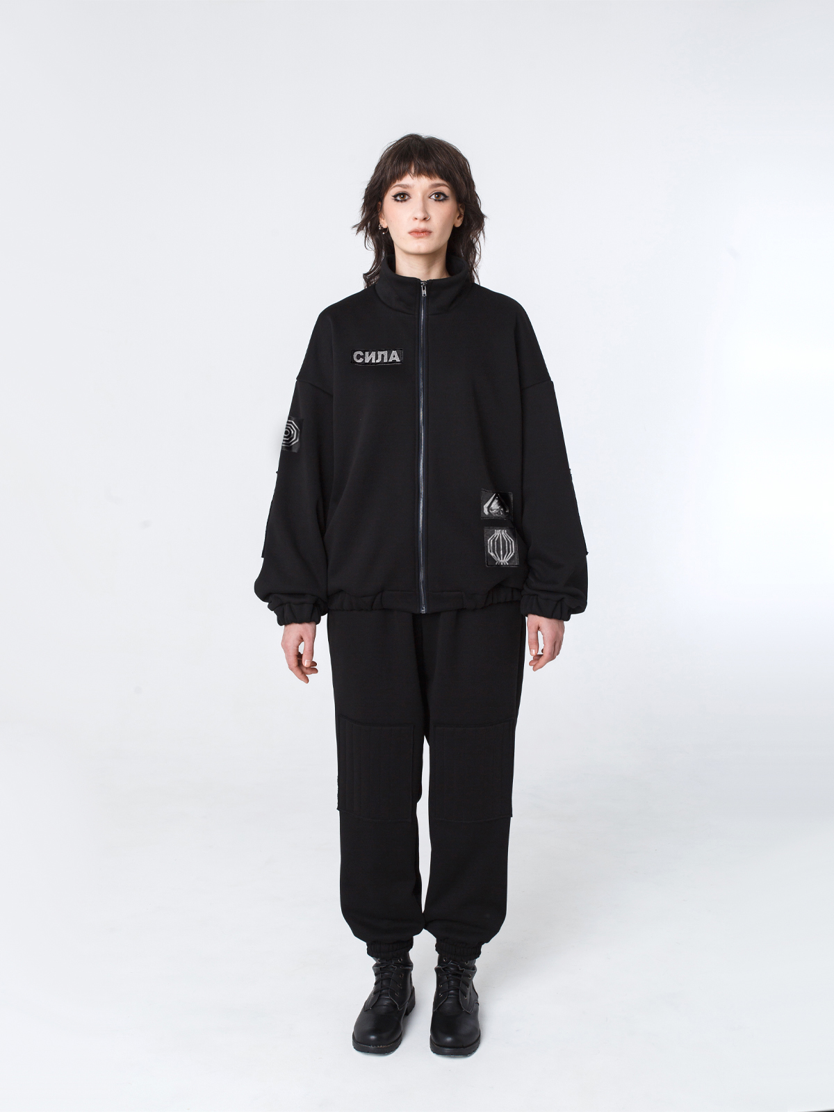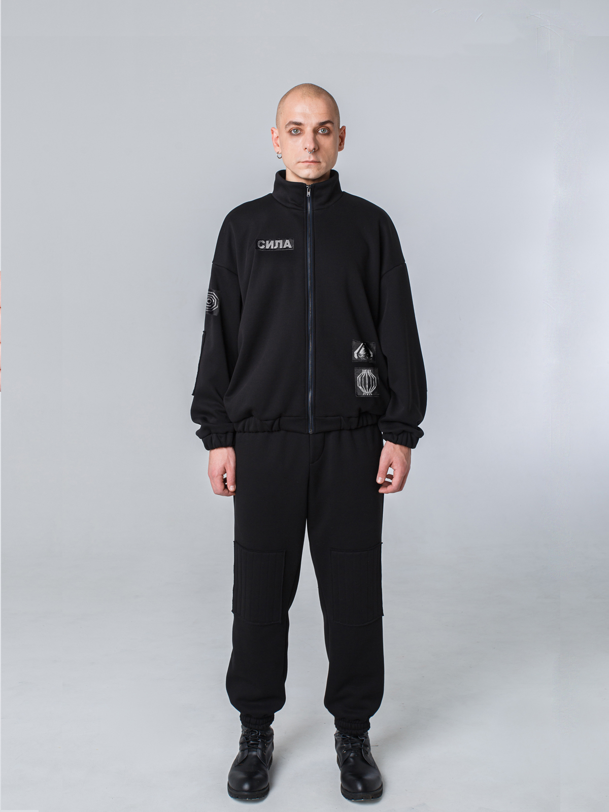 Комфортная и функциональная олимпийка с нашивками. Застежка на металлическую молнию. Высокий ворот, резинки по низу и манжетам, глубокие карманы в боковых швах. На локтях декоративные стеганые аппликации-заплатки из основного полотна. Нашивки также выполнены из основной ткани изделия, принт нанесён вручную в технике набойки. Инновационный материал интерсофт имеет хлопковую лицевую сторону и мягкий флис с изнанки. Не скатывается, не мнется и быстро сохнет.