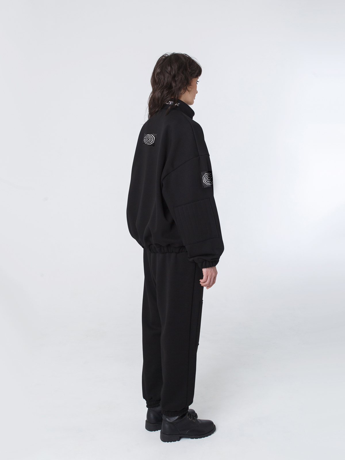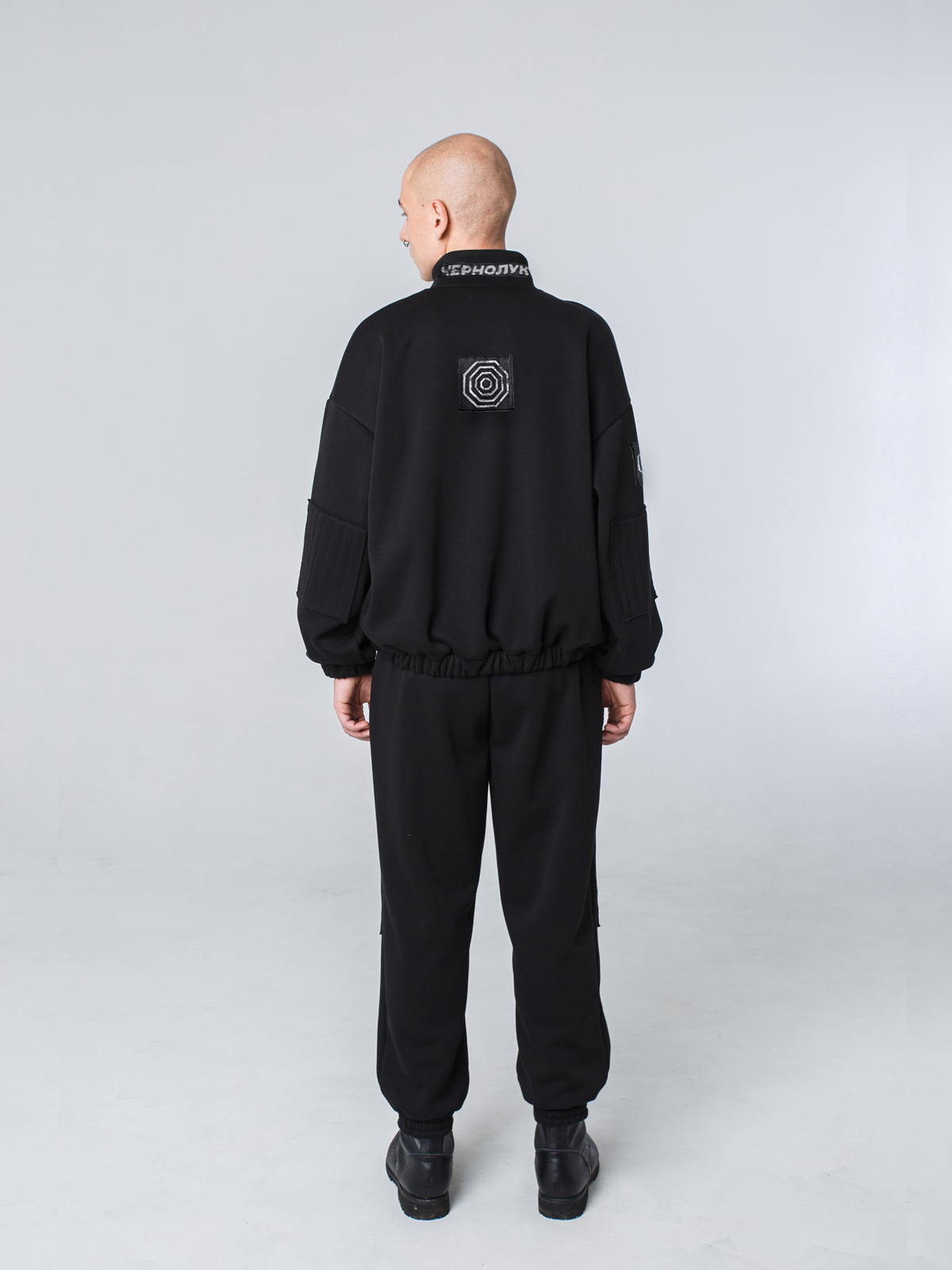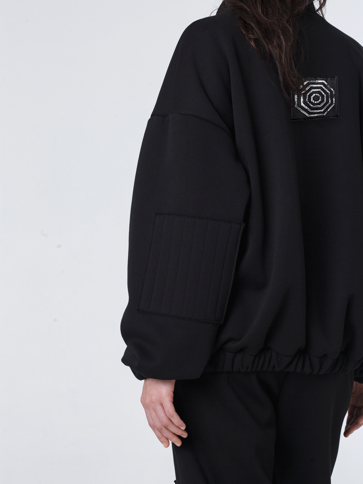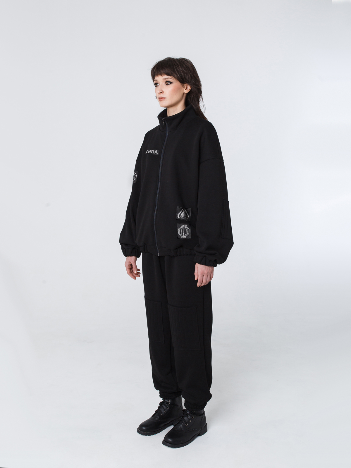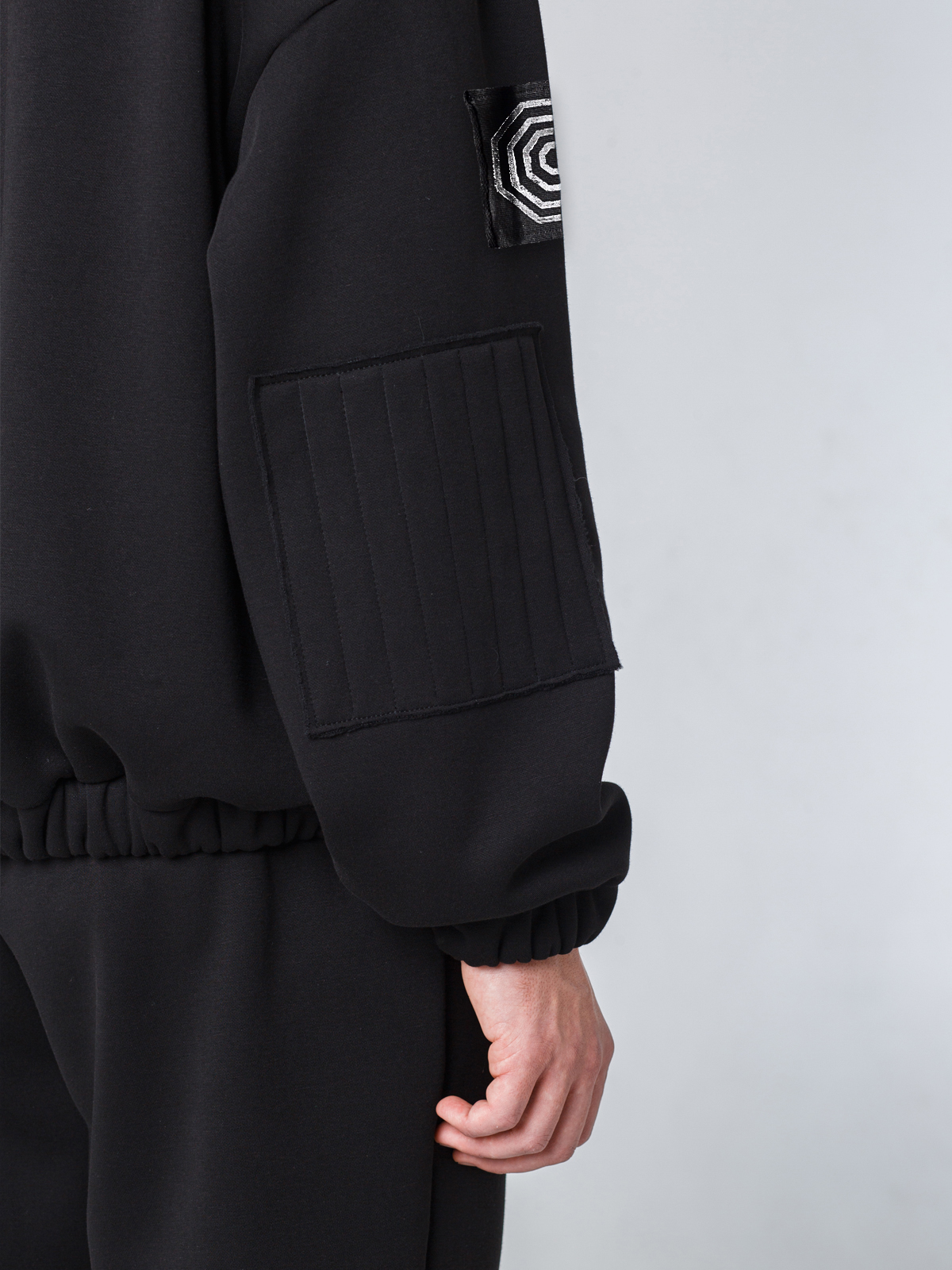 Комфортная и функциональная олимпийка с нашивками. Застежка на металлическую молнию. Высокий ворот, резинки по низу и манжетам, глубокие карманы в боковых швах. На локтях декоративные стеганые аппликации-заплатки из основного полотна. Нашивки также выполнены из основной ткани изделия, принт нанесён вручную в технике набойки. Инновационный материал интерсофт имеет хлопковую лицевую сторону и мягкий флис с изнанки. Не скатывается, не мнется и быстро сохнет.